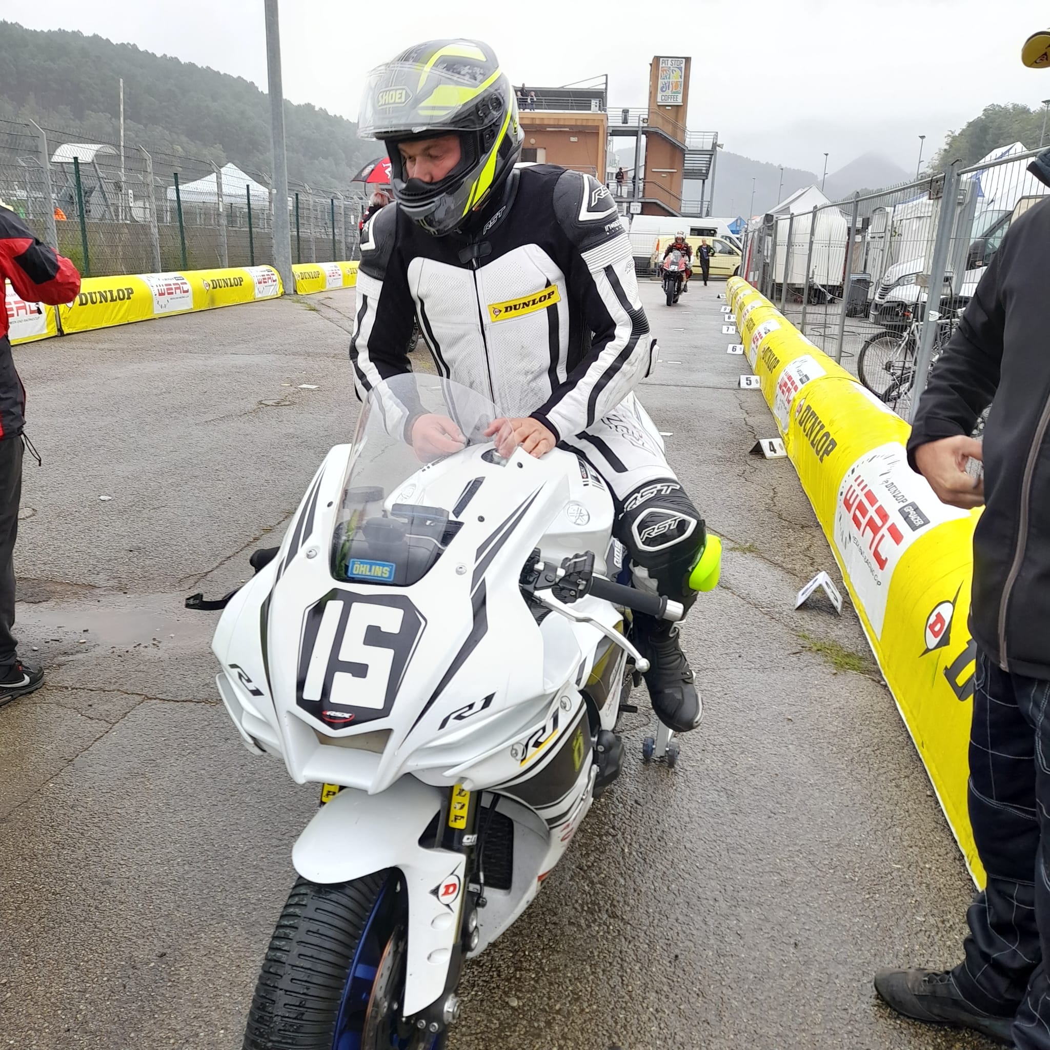 Il pleut, Edouard part avec les pneus pluie. Il subit les 15 premières minutes car il a peut d'expérience sur le mouillé. La piste commence à sécher et il devient plus confiant.
